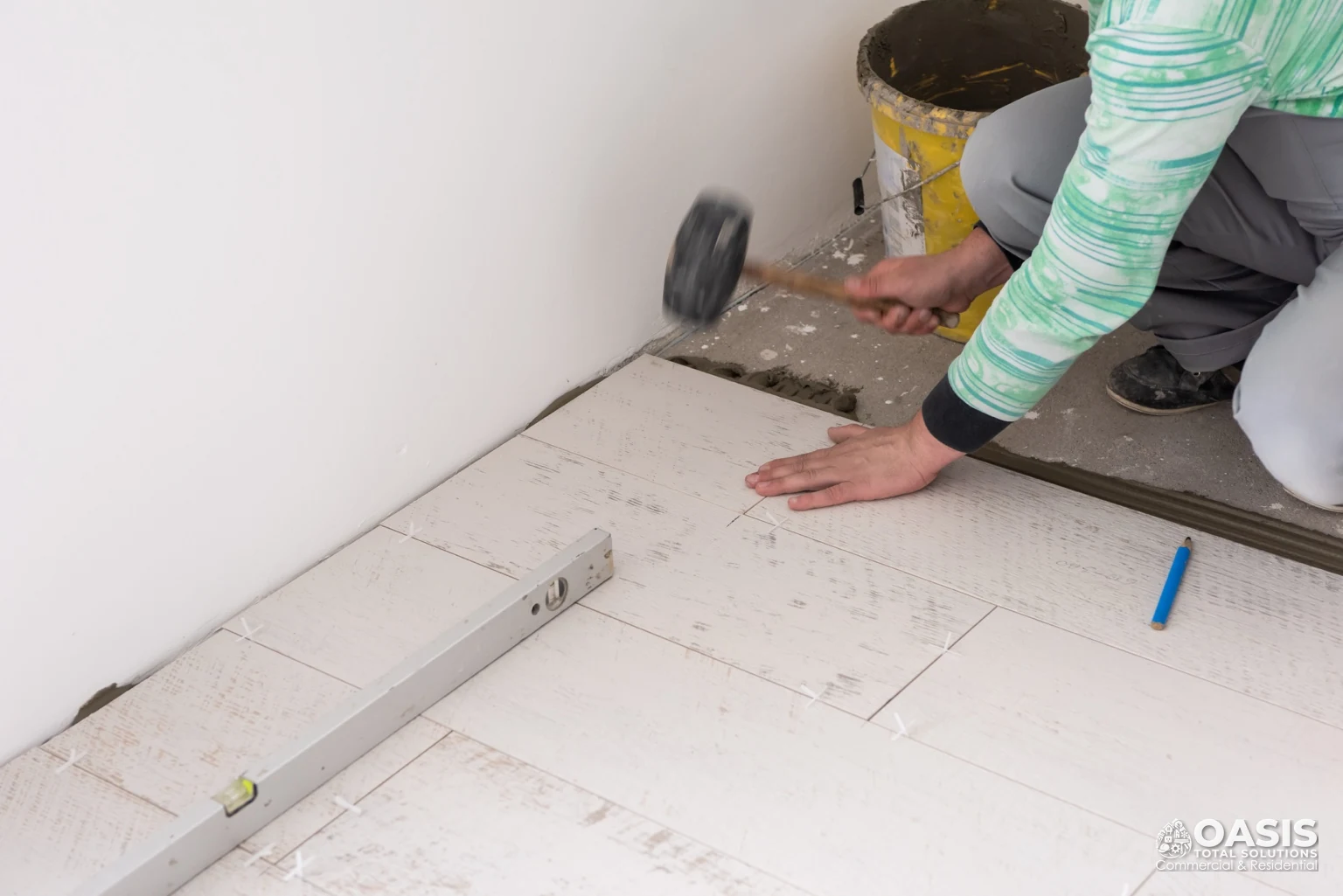 Level/patch and acclimate materials. We phase areas around your hours to maintain access.