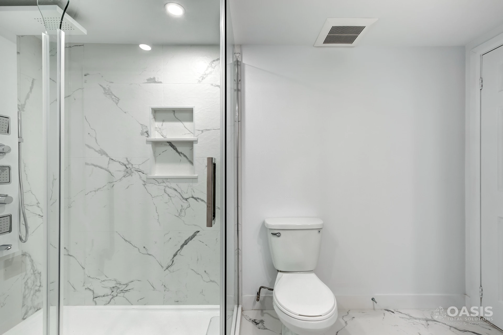 Tubs/showers, tile, vanities and waterproofing done right. Exhaust fans, GFCI, mixing valves and slope-to-drain checked.